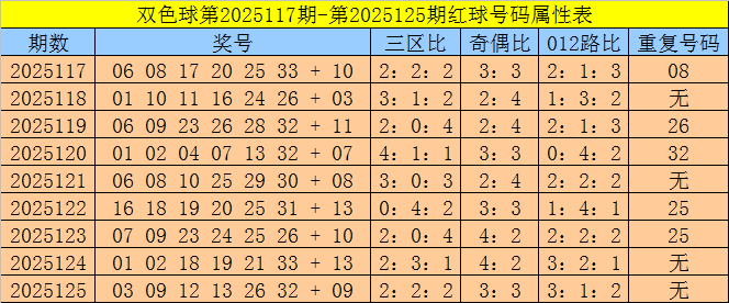 福彩双色球第2025125期奖号为:03 09 12 13 26 32 + 09,红球奇偶比为3:3,三区比为2:2:2,012路比为3:1:2,重号:无。