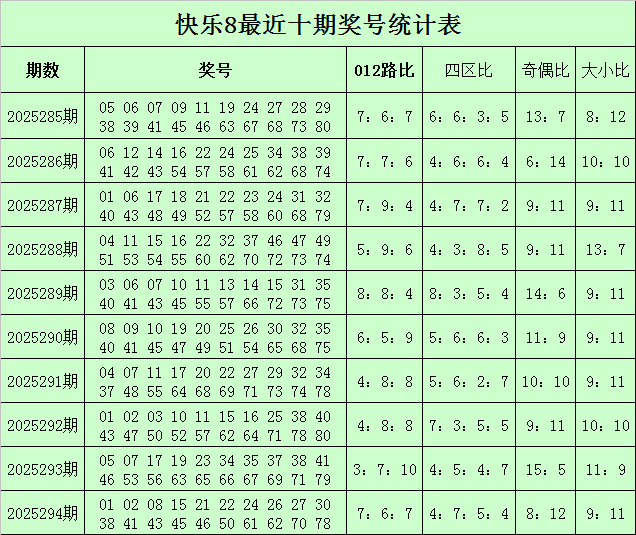 福彩景况8第2025294期开奖追想:01 02 08 15 21 22 24 26 27 30 38 41 43 45 46 50 61 62 70 78,其中奖号012路比为7:6:7,四区比为4:7:5:4,奇偶比为8:12,大小比为9:11。