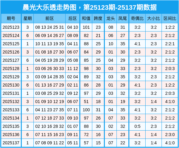 大乐透第25137期前区奖号为:07 08 09 11 22;后区05 11。前区号码质合比为2:3,奇偶比为3:2,三区比为4:1:0。
