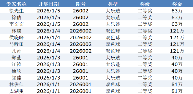 除此以外,1月份前5天还爆出13次二等大奖,其中各人凡哥[稽查最新有贪图]、马昕田[稽查最新有贪图]、侯晓峰[稽查最新有贪图]、林蝶[稽查最新有贪图]在双色球第26002期均掷中二等,揽下121万大奖,此外还有各人李文文[稽查最新有贪图]、徐倩[稽查最新有贪图]、徐先生[稽查最新有贪图]掷中大乐透第26002期二等大奖63万,相同后劲全齐,详见下表!