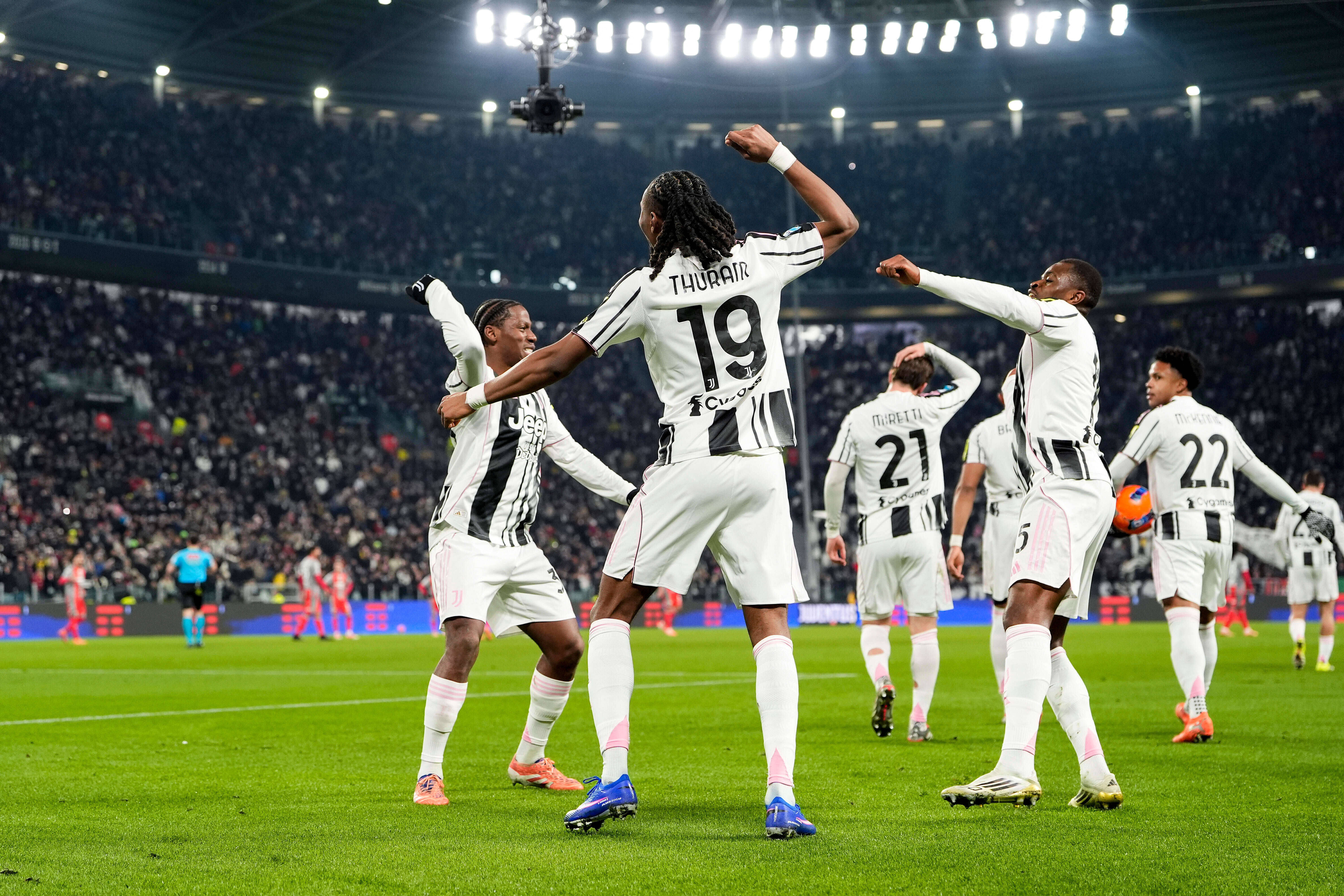 1月12日,尤文图斯队球员在比赛中庆祝进球。新华社/好意思联当日比赛中,尤文图斯开局便展现出邃密景色。第12分钟,米雷蒂尝试远射,皮球击中队友布雷默后发生折射入彀,主队拔得头筹。仅三分钟后,图拉姆带球激动至禁区前沿后分球,助攻戴维破门,将比分改写为2:0。第27分钟,克雷莫内塞主帅尼科拉因起火裁判取消点球的判罚,被红牌罚出场。第35分钟,“老媪东说念主”继续扩大越过上风,图拉姆制造点球,伊尔迪兹主罚点球被扑出后补射到手。